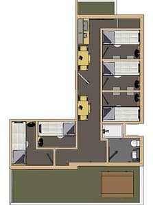 Έχοντας κοινόχρηστη κουζίνα και μπάνιο, προκύπτει μια διαρρύθμιση που εξυπηρετεί ικανοποιητικά την συγκατοίκηση 5 φοιτητών.